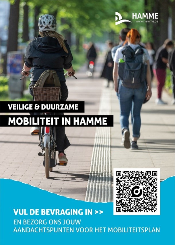 De enquête loopt van 23 maart tot en met 12 april, invullen duurt ongeveer een kwartier. Deelnemen kan via www.maplix.com/survey/nl/Mobiliteitsplan-Hamme of via de QR-code op onderstaande flyer.